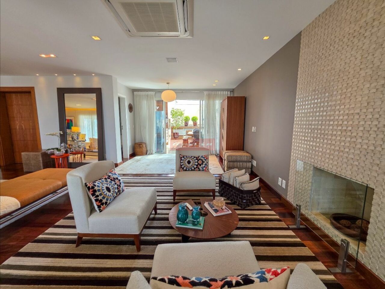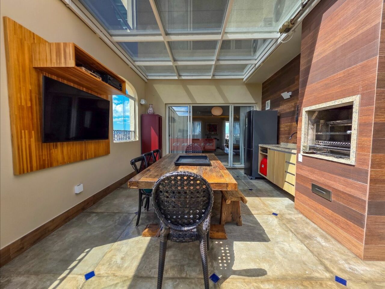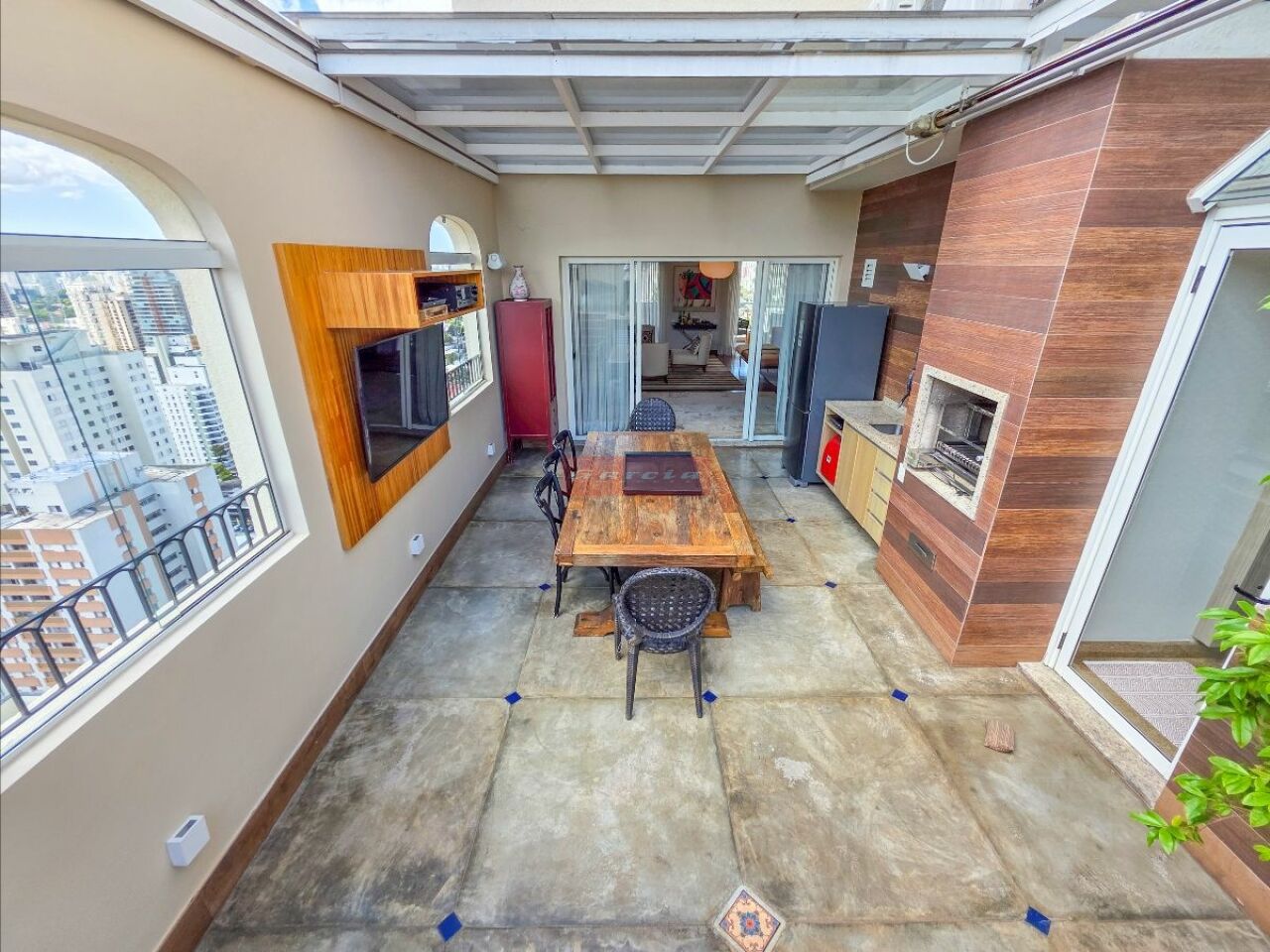 A cobertura oferece um living para até quatro ambientes, lareira, varanda frontal com vista aberta e área externa com piscina e varanda gourmet com teto retrátil e piso em cimento queimado.