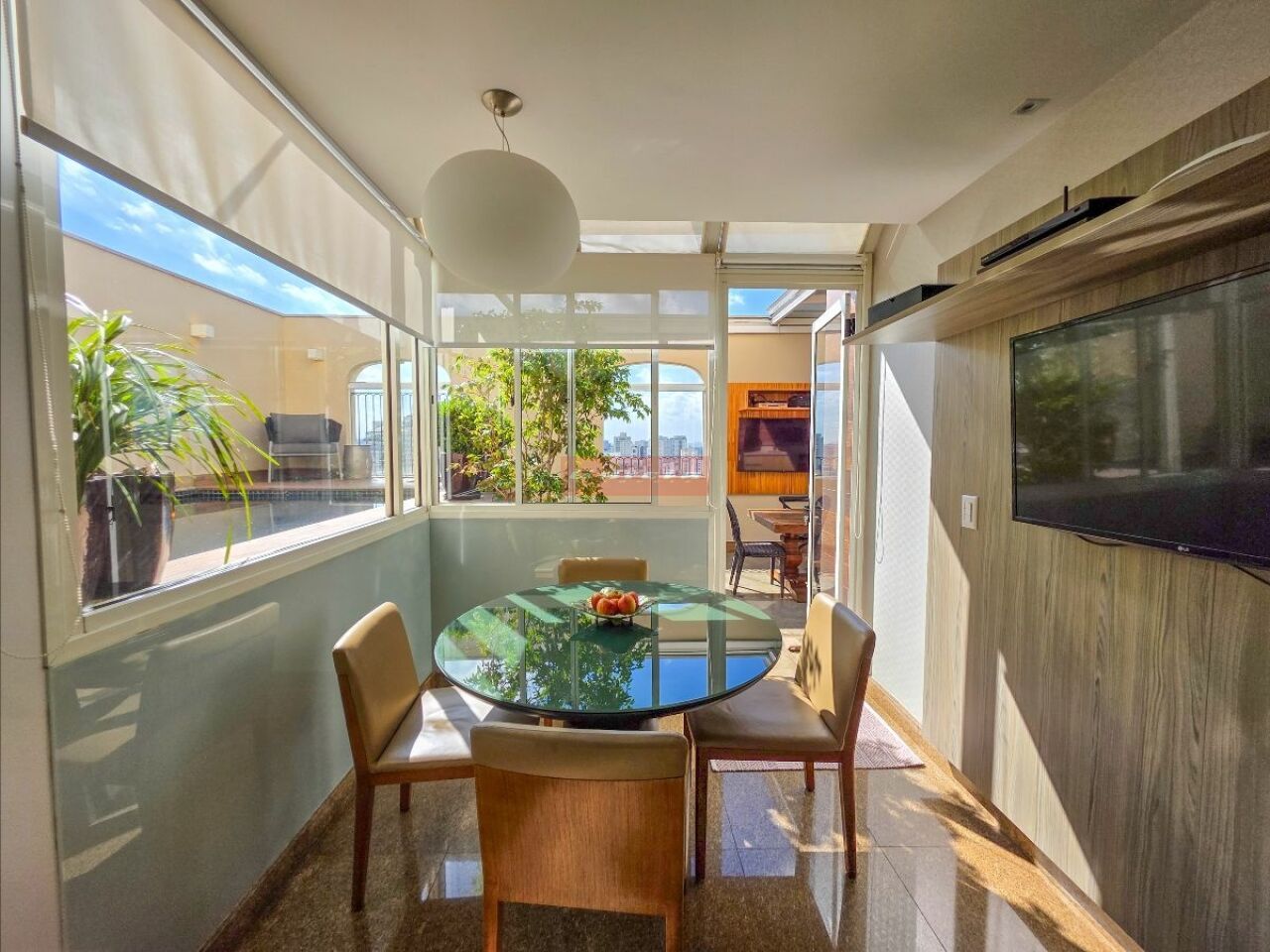 A sala de almoço conecta-se à varanda gourmet e a área da piscina.